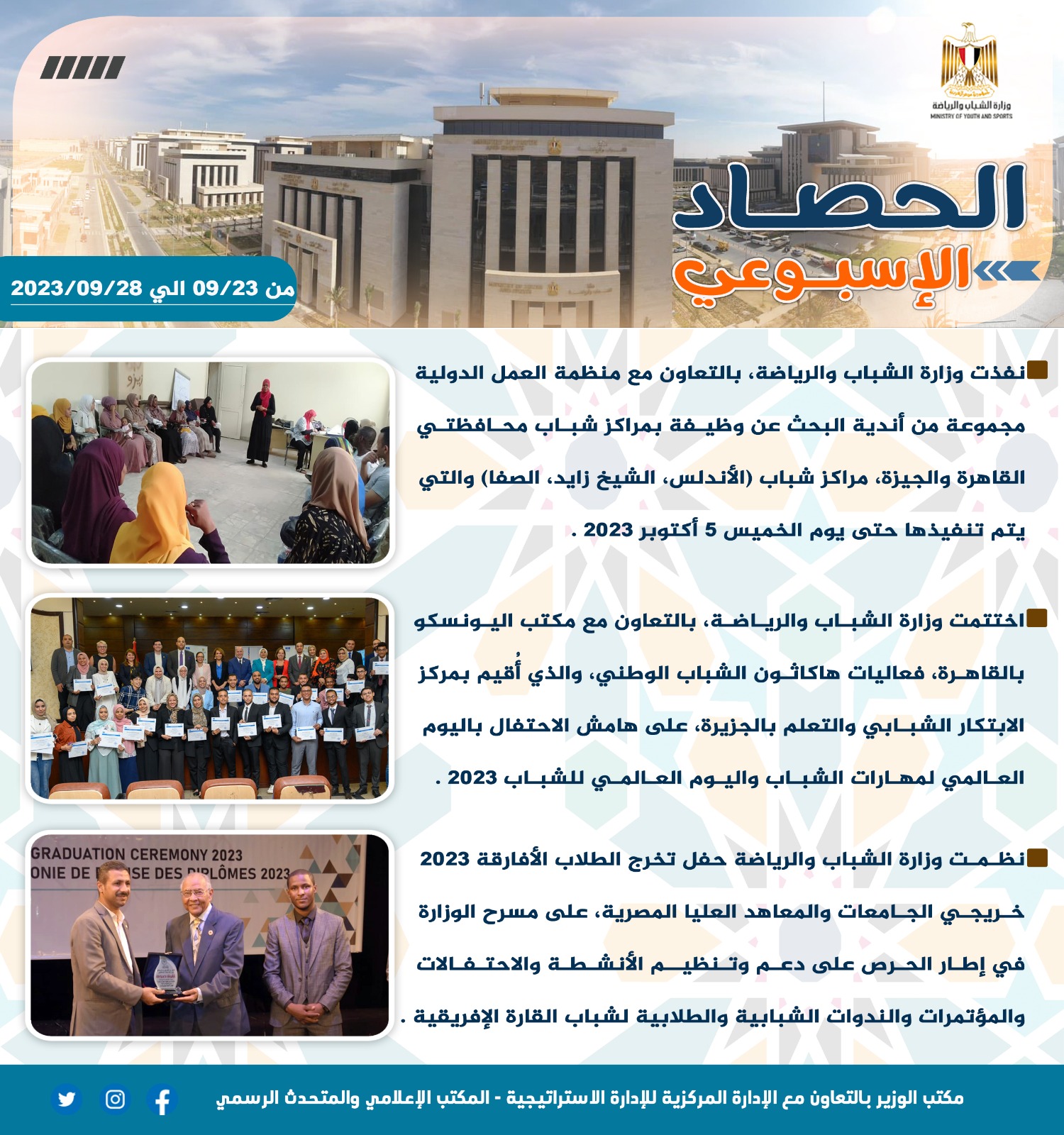 - نظمت وزارة الشباب والرياضة حفل تخرج الطلاب الأفارقة ٢٠٢٣، خريجي الجامعات والمعاهد العليا المصرية، على مسرح الوزارة، في إطار الحرص على دعم وتنظيم الأنشطة والاحتفالات والمؤتمرات والندوات الشبابية والطلابية لشباب القارة الإفريقية.
