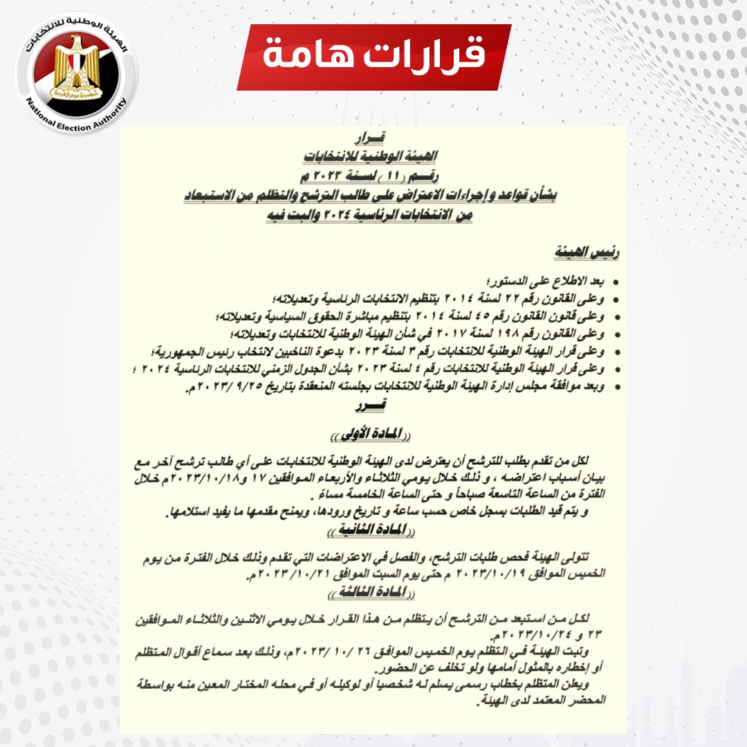 نصت المادة الأولى من قرار الهيئة الوطنية للانتخابات رقم 11 لسنة 2023، لكل من تقدم بطلب للترشح أن يعترض لدى الهيئة الوطنية للانتخابات على أي طالب ترشح آخر، مع بيان أسباب اعتراضه، وذلك خلال يومي الثلاثاء والأربعاء، 17 و18 أكتوبر، خلال الفترة من الساعة التاسعة صباحًا حتى الساعة الخامسة مساءً.