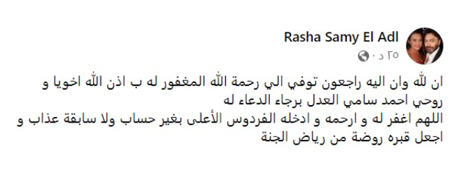 وكتبت رشا سامي العدل، عبر صفحتها قائلة : "إنا لله وإنا إليه راجعون توفي إلى رحمة الله المغفور له بإذن الله أخويا وروحي أحمد سامي العدل".