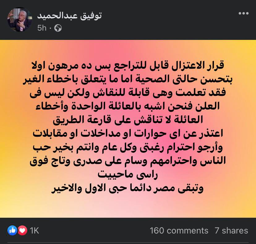 وأضاف: "اعتذر عن أى حوارات أو مداخلات أو مقابلات وأرجو احترام رغبتي"، مختتمًا رسالته بقوله: "كل عام وأنتم بخير، حب الناس واحترامهم وسام على صدرى وتاج فوق رأسي ما حييت".