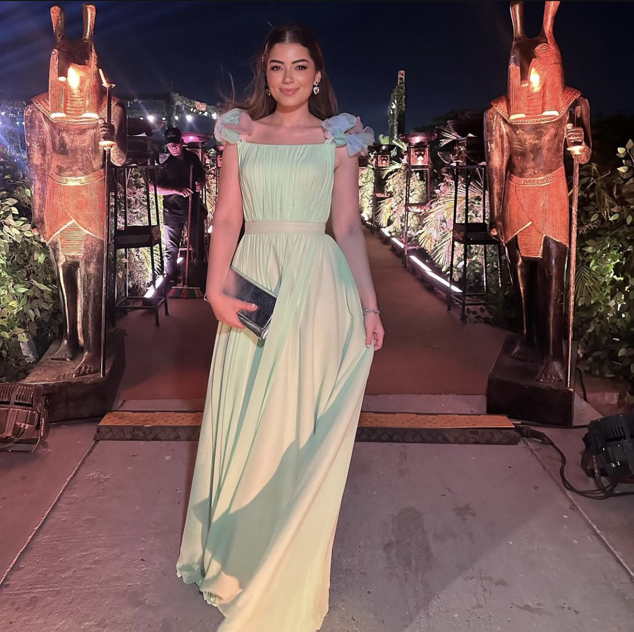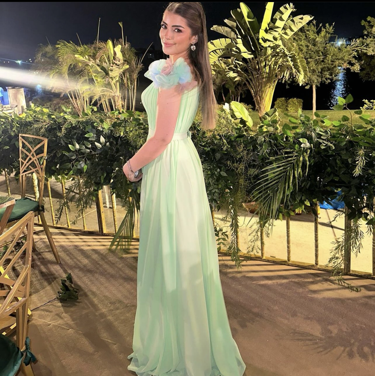 وبدت ليلى زاهر بفستان تميز بألوانه الهادئة والجذابة، وكان باللون المينت جرين ومُزين بحمالات مصنوعة من التُل باللون بيبي بلو مع السيمون والأخضر ومحدد الخصر؛ ليبرز رشاقتها وقوامها الممشوق.