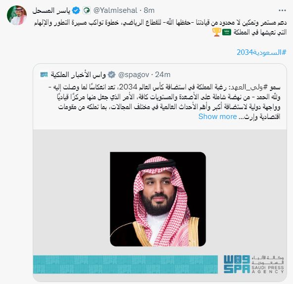والتي كانت في تعقيب لما كتبته وكالة الأنباء السعودية من خلال حسابها الرسمي عبر مواقع التواصل الاجتماعي: "سمو ولي العهد رغبة المملكة في استضافة كأس العالم 2034، تعد انعكاسًا لما وصلت إليه - ولله الحمد - من نهضة شاملة على الأصعدة والمستويات كافة، الأمر الذي جعل منها مركزًا قياديًا وواجهة دولية لاستضافة أكبر وأهم الأحداث العالمية في مختلف المجالات، بما تملكه من مقومات اقتصادية وإرث حضاري وثقافي عظيم".