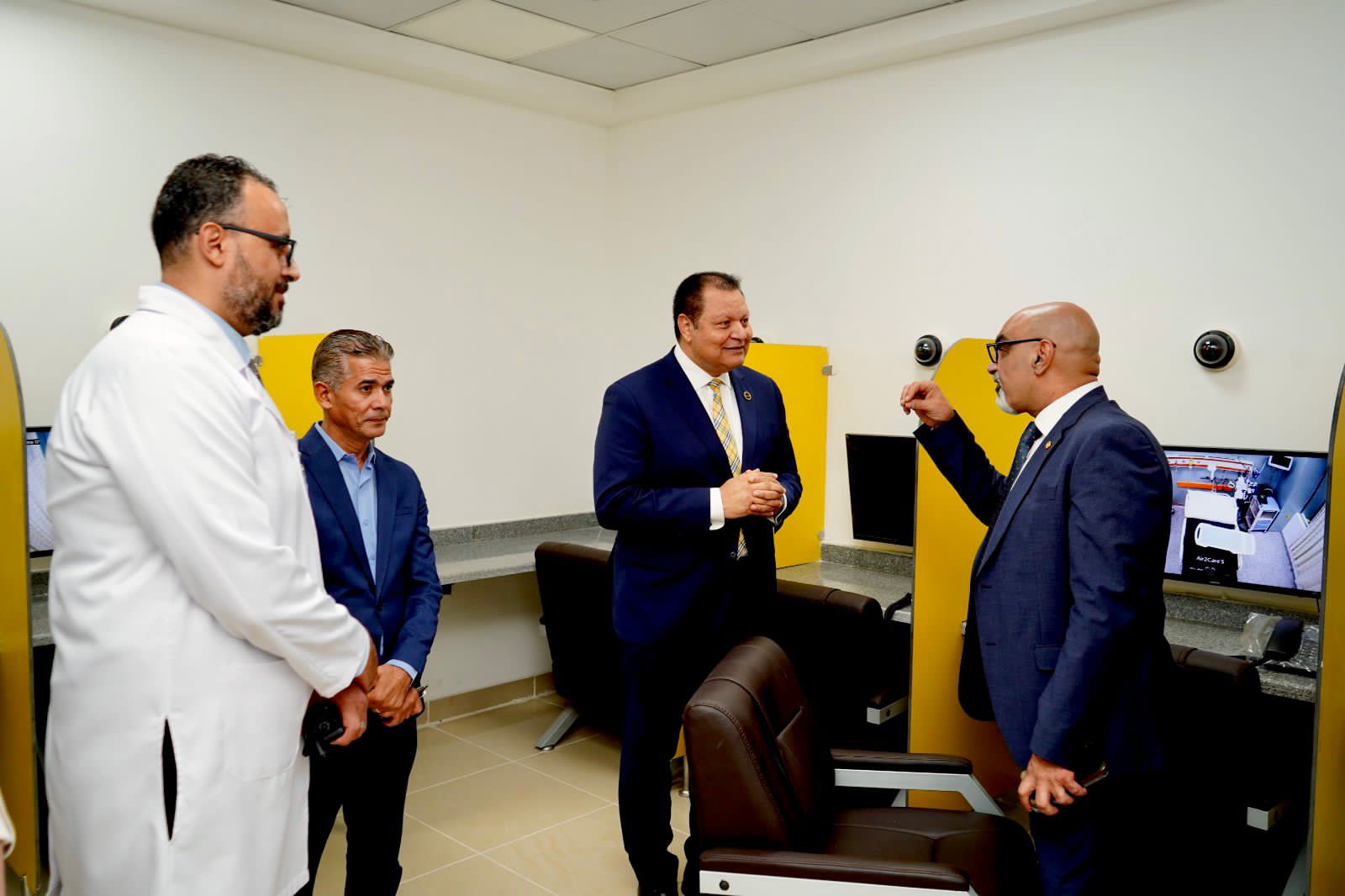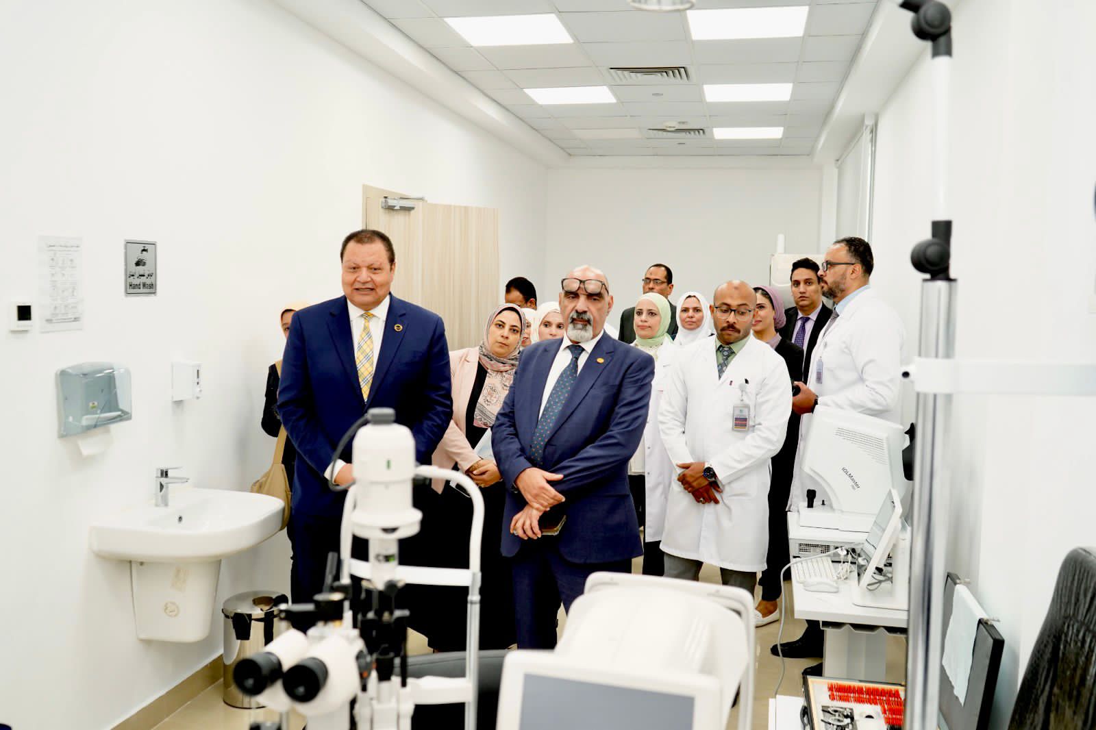 واختتم رئيس الهيئة العامة للاعتماد والرقابة الصحية والوفد المرافق له جولته، بتفقد العيادات الخارجية، والتعرف على خط سير المريض وذويه بدءا من استقباله وتوقيع الكشف الطبي عليه. كما تفقد ملف المريض الطبي وتبين استيفائه لمتطلبات الاعتماد، واستمع كذلك الى الطاقم الطبي بعيادات الرمد والقلب والصدر، بالاضافة الى زيارة المعامل الطبية وبنك الدم، والغرفة المركزية المستحدثه بالكاميرات والشاشات للتواصل عن بعد بين المرضى في الرعاية المركزة وذويهم.