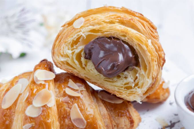 - ثم تحشى بالشوكولاتة واللوز وتلف على شكل كرواسون.