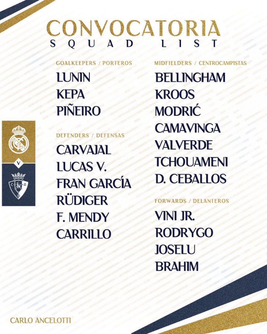 أعلن كارلو أنشيلوتي المدير الفني ريال مدريد، قائمة الفريق لخوض مباراة أوساسونا، غدا السبت بالجولة التاسعة من الدوري الإسباني.