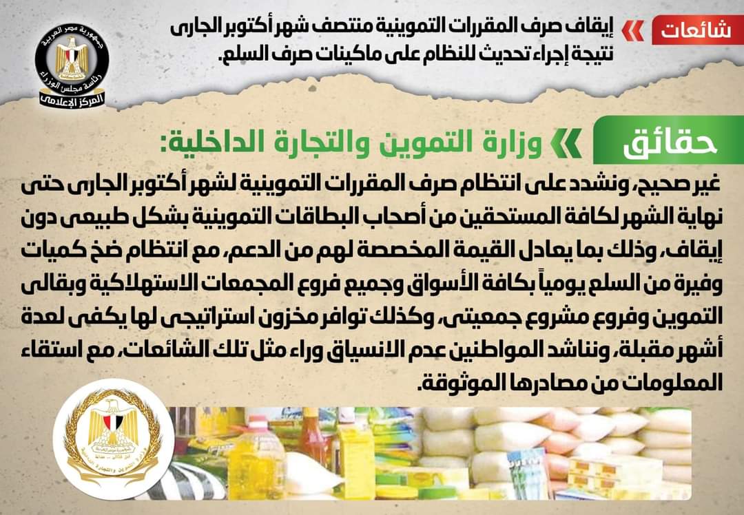 وأكد المركز الإعلامي لمجلس الوزراء أنه تواصل مع وزارة التموين والتجارة الداخلية، والتي نفت تلك الأنباء، مُؤكدةً أنه لا صحة لإيقاف صرف المقررات التموينية منتصف شهر أكتوبر الجاري نتيجة إجراء تحديث للنظام على ماكينات صرف السلع، مُشددةً على انتظام صرف المقررات التموينية لشهر أكتوبر الجاري حتى نهاية الشهر لكافة المستحقين من أصحاب البطاقات التموينية بشكل طبيعي دون إيقاف، وذلك بما يعادل القيمة المخصصة لهم من الدعم، مع انتظام ضخ كميات وفيرة من السلع يوميًا بكافة الأسواق وجميع فروع المجمعات الاستهلاكية وبقالي التموين وفروع مشروع جمعيتي، وكذلك توافر مخزون استراتيجي لها يكفي لعدة أشهر مقبلة، مُناشدةً المواطنين عدم الانسياق وراء مثل تلك الشائعات، مع استقاء المعلومات من مصادرها الموثوقة.