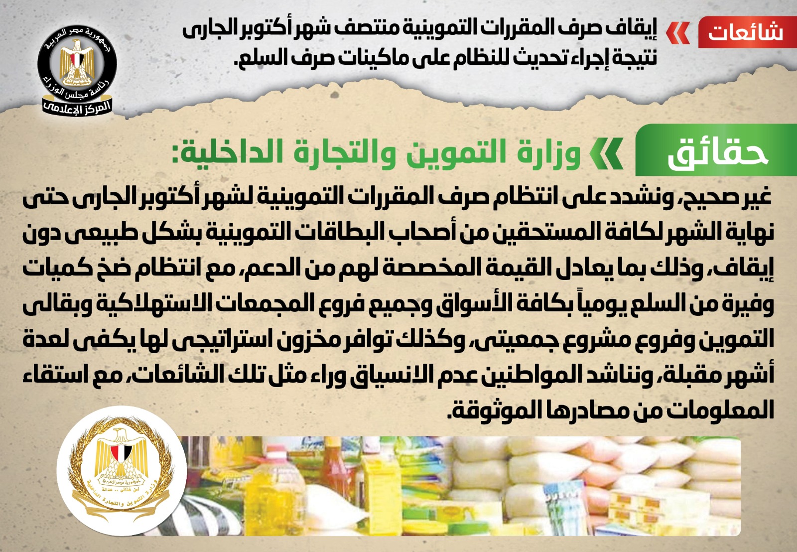 أكد المركز الإعلامي لمجلس الوزراء ، ووزارة التموين والتجارة الداخلية، أنه لا صحة لإيقاف صرف المقررات التموينية منتصف شهر أكتوبر الجاري، نتيجة إجراء تحديث للنظام على ماكينات صرف السلع.