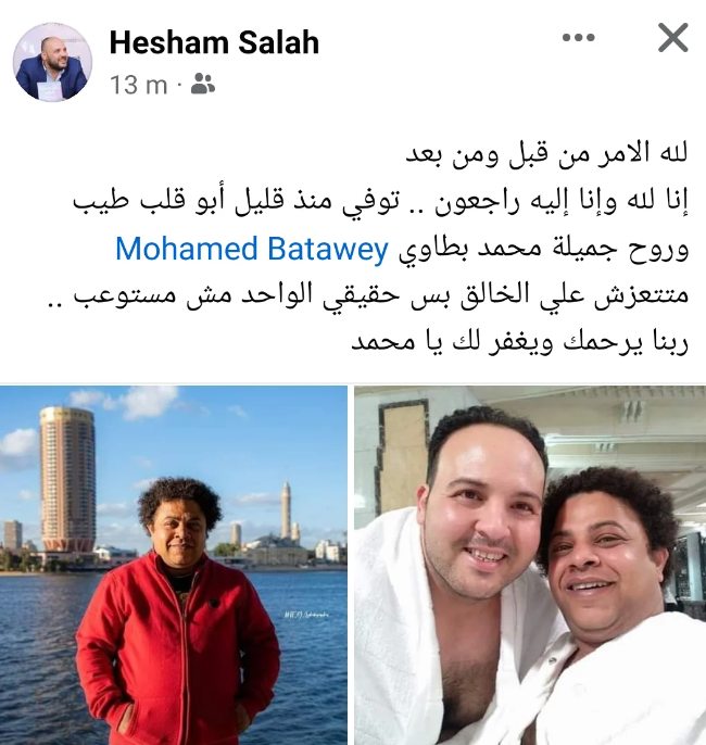 وكتب هشام صلاح، على صفحته قائلا : “ لله الامر من قبل ومن بعد.. انا لله وانا اليه راجعون، توفى منذ قليل ابو قلب ابيض وروح جميلة محمد بطاوي.. متتعزش ع الخالق بس حقيقي الواحد مش مستوعب ربنا يرحمك ويغفر لك يا محمد”.