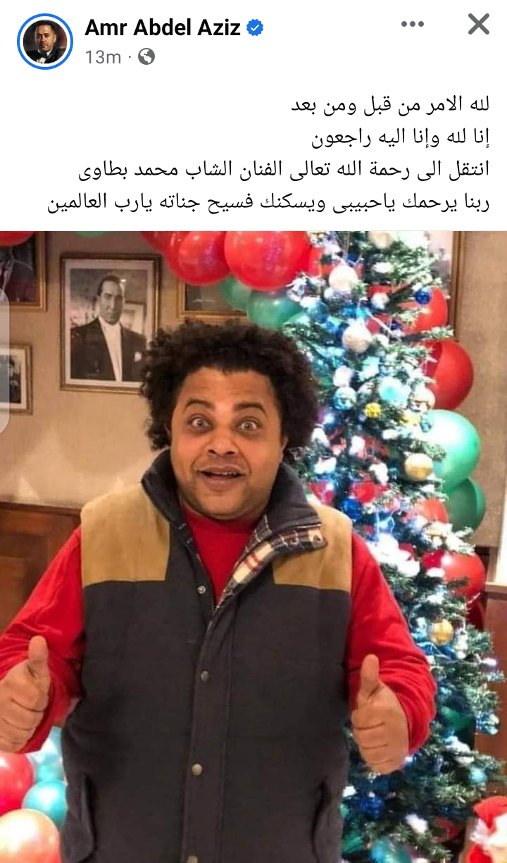 نعى الفنان عمرو عبد العزبز، الفنان الشاب محمد بطاوي نجم مسرح مصر الذي رحل عن عالمنا صباح اليوم، وذلك عبر صفحته الشخصية على موقع التواصل الاجتماعي الشهير فيسبوك.