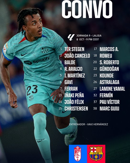أعلن تشافي هيرنانديز، المدير الفني للفريق الأول لكرة القدم بنادي برشلونة، عن قائمته التى ستخوض مباراة غرناطة في الجولة التاسعة من بطولة الدوري الإسباني.