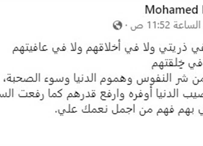 وكتب محمد عبر حسابه: "اللهم لا تفجعني في ذريتي ولا في أخلاقهم ولا في عافيتهم.. ولا في دينهم ولا في خِلقتهم.. وأحفظهم اللهم من شر النفوس وهموم الدنيا وسوء الصحبة، وأجعل لهم من نصيب الدنيا أوفره وارفع قدرهم كما رفعت السموات السبع من غير عمد وقر عيني بهم فهم من أجمل نعمك علي".