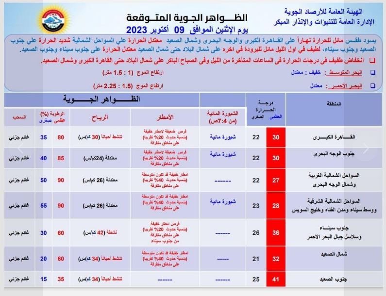وتشهد حالة الطقس غدًا شبورة مائية من (4 إلى 7 صباحًا تقريبًا) على بعض الطرق الزراعية والسريعة والقريبة من المسطحات المائية المؤدية من وإلى مناطق من القاهرة الكبرى والوجه البحري ومدن القناة ووسط سيناء قد تكون كثيفة أحيانًا، ونشاط رياح على مناطق من القاهرة الكبرى وجنوب سيناء وسلاسل جبال البحر الأحمر وشمال وجنوب الصعيد.