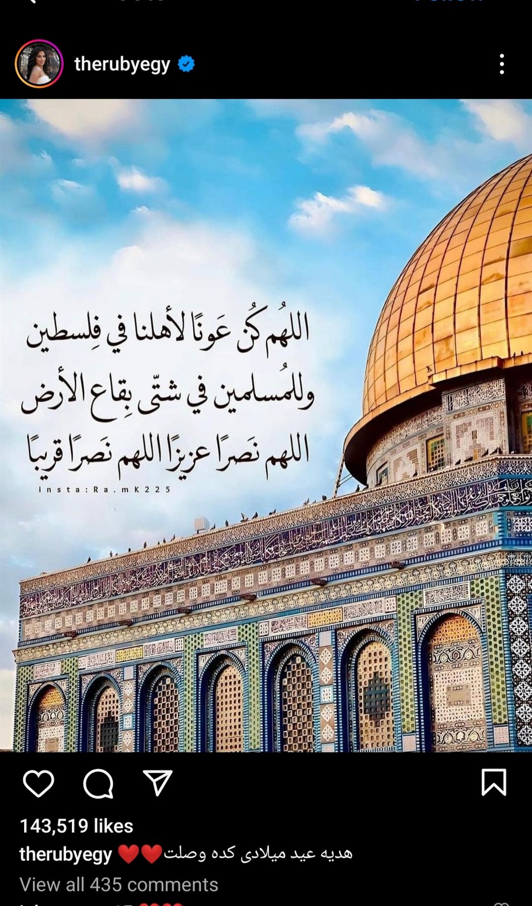 وشاركت روبي، منشورا عبر صفحتها الرسمية على موقع تبادل الصور والفيديوهات "إنستجرام"، علقت قائلة: "هدية عيد ميلادي كده وصلت.. اللهم كن عونا لأهلنا في فلسطين وللمسلمين في شتى بقاع الأرض.. اللهم نصرًا عزيزًا".