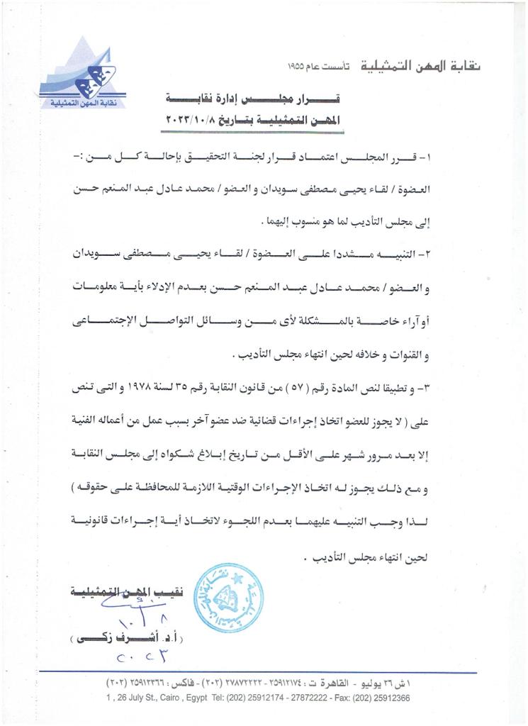 - التنبيه المشددا على العضو لقاء يحيى مصطفى سويدان والعضو محمد عادل عبد المنعم حسن بعدم الإدلاء بأية معلومات أو آراء خاصة بالمشكلة لأى من وسائل التواصل الإجتماعى والقنوات وخلافه لحين انتهاء مجلس التأديب.