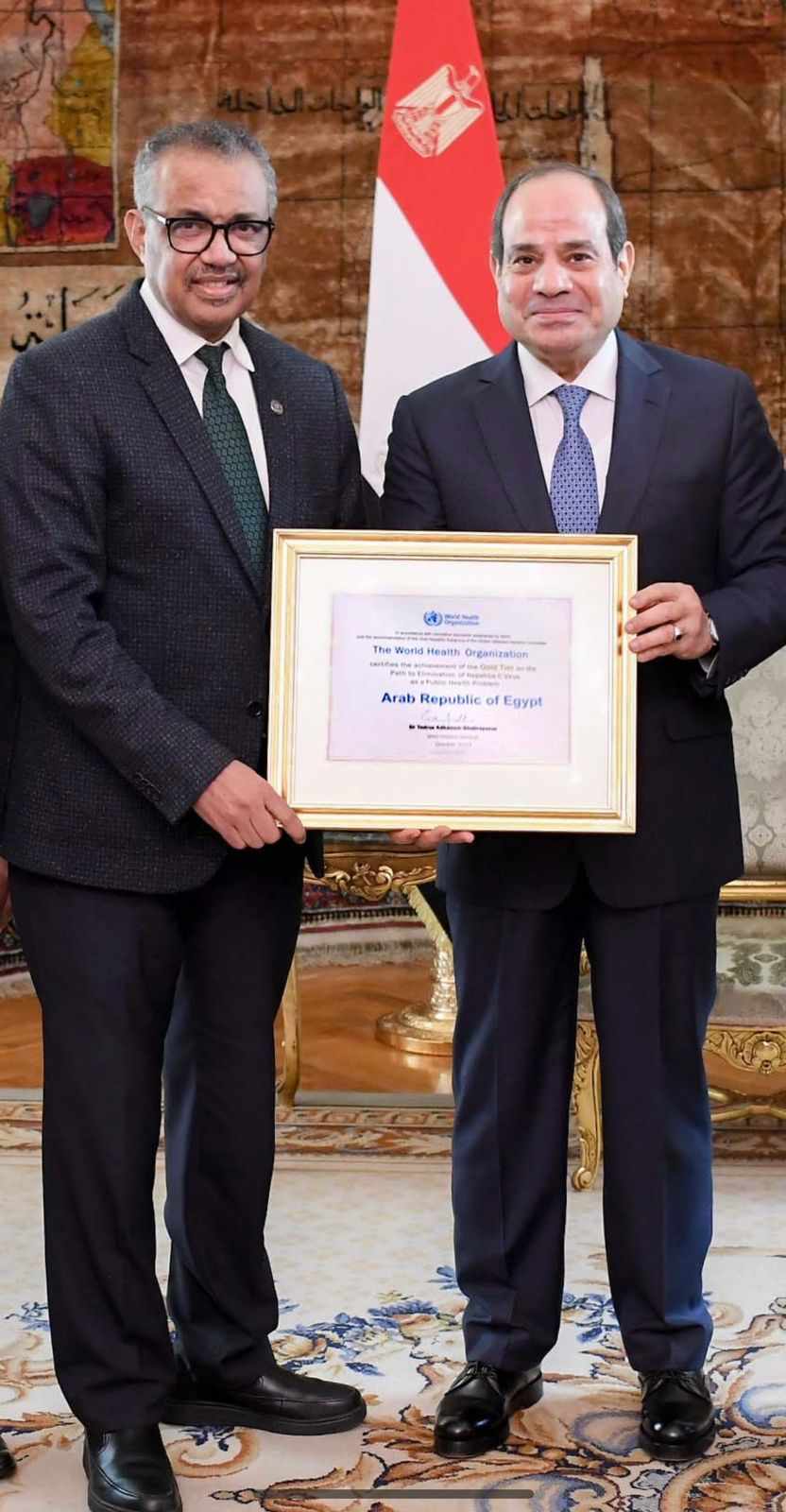 وصرح المستشار أحمد فهمي المتحدث الرسمي باسم رئاسة الجمهورية أن مدير عام منظمة الصحة العالمية سلّم الرئيس شهادة المستوى الذهبي على مسار القضاء على فيروس "سي" في مصر، مقدماً التهنئة لمصر وموضحاً أنها أصبحت الدولة الأولى في العالم التي تحصل على هذا الإشهاد، بعد تحقيقها، في زمن قياسي، قصة نجاح عالمية يحتذى بها، في التحول من كونها أعلى الدول من حيث ارتفاع معدلات الإصابة بفيروس "سي" إلى أول دولة في العالم تصل لهذا المستوى المتميز في القضاء على الفيروس.