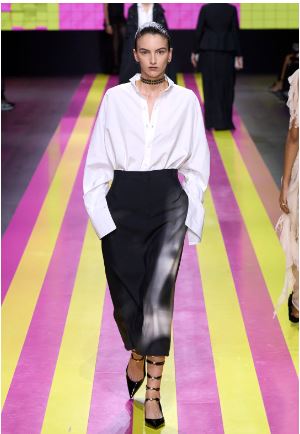 تصدر القميص الأبيض منصات موضة ربيع وصيف 2024، ليجذب إنتباه الجميع في أسبوع الموضة بباريس، وقدم بموديلات عصرية أنيقة، وجدنا لدى ماركة كريستيان ديور Christian Dior قميص سادة Oversized مصمم بأكمام طويلة تغطي كف اليد ومنسق مع تنورة ميدي سوداء مستقيمة القصة وحذاء غلاديتور أسود مزدان بحبات اللؤلؤ الصغيرة.