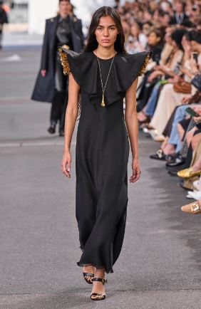 وقدم مصممي الأزياء تنوع هائل يرضى جميع الأذوق ليخطف قلوب محبات الموضة للأناقة والرقي بتصاميم فساتين ا الأكمام القصيرة البارزة على منصات عروض أسابيع الموضة لربيع وصيف 2024، ظهرت عارضة ماركة كلوي Chloe بفستان أسود طويل مستقيم القصة مزين بتفاصيل ذهبية على أحرف الأكمام، ومنسق مع صندال أسود سادة.