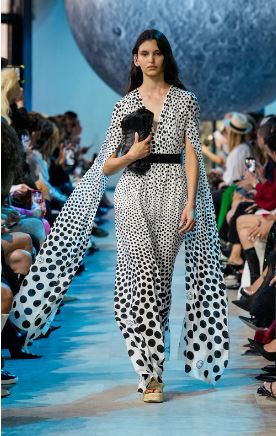 وبرزت موضة الفساتين المنقطة Polka Dots موسمي ربيع وصيف 2024، لتلمع صيحة Polka Dots وتثبت حضورها من جديد، ويقدم المصمم اللبناني إيلي صعب Elie Saab واحد من أجمل الفساتين التي رأيناها خلال عروض أسبوع الموضة في باريس، تميز بقصته الناعمة والياقة الـ V Neck وأكمامه الطويلة الأشبه بالكاب التي يصل طولها إلى حافة الفستان، جربي تنسيقه مع حذاء أسود وحقيبة حمراء.
