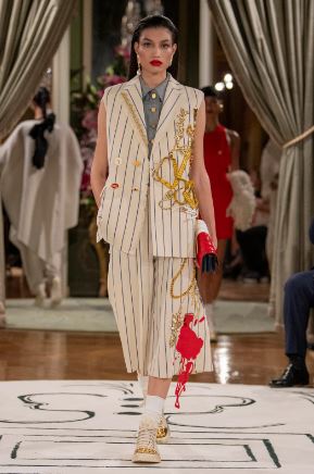قُدمت البدلات على منصات عروض أسبوع باريس بقصات وتفاصيل مميزة طغت عليها روح الإبتكار، قدمت ماركة سكياباريللي Schiaparelli بدلة مخططة مكونة من سترة طويلة من دون أكمام، وبنطال Culotte واسع، أعجبنا التطريز الذهبي الذي زينها ونقل التصميم إلى مستوى آخر من الفخامة، جربي تنسيقها مع قميص أزرق وانتعلي حذاء ذهبي واحملي حقيبة باللون الأحمر.