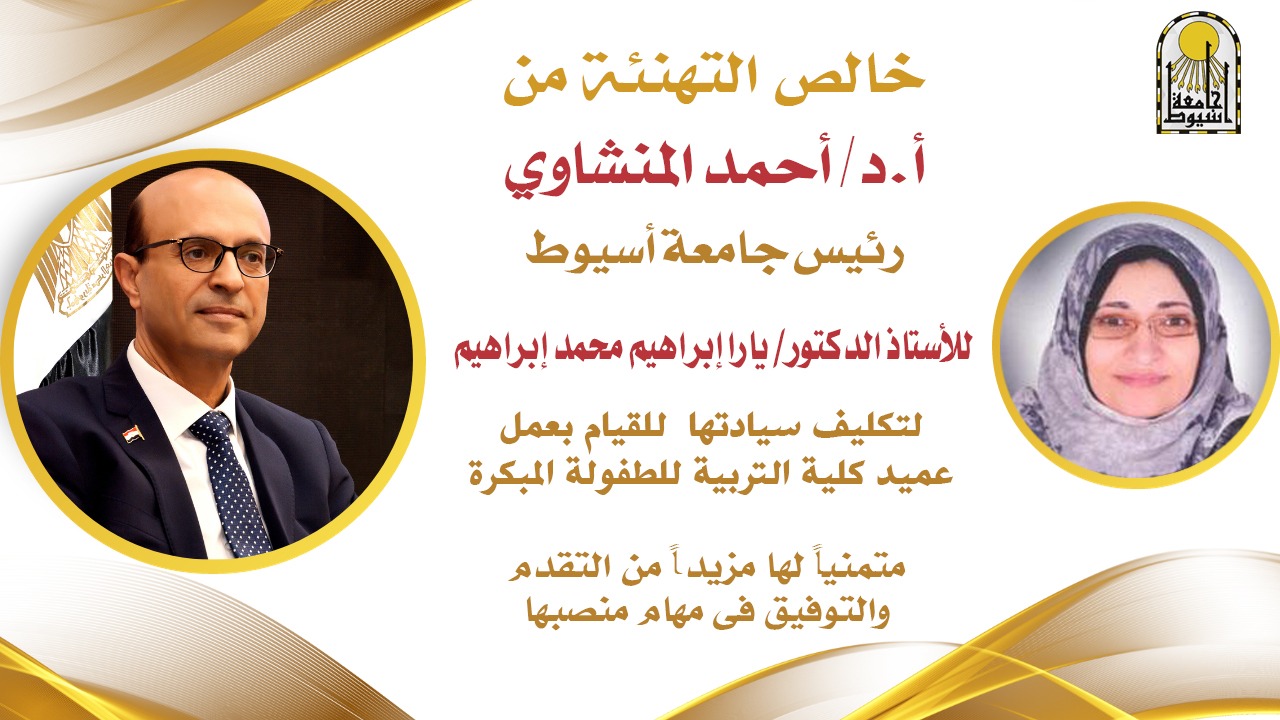 أصدر الدكتور أحمد المنشاوي رئيس جامعة أسيوط؛ قراراً بتكليف الدكتورة يارا إبراهيم محمد إبراهيم الأستاذة بقسم العلوم التربوية بكلية التربية للطفولة المبكرة؛ للقيام بأعمال عميد الكلية بالجامعة لمدة عام.