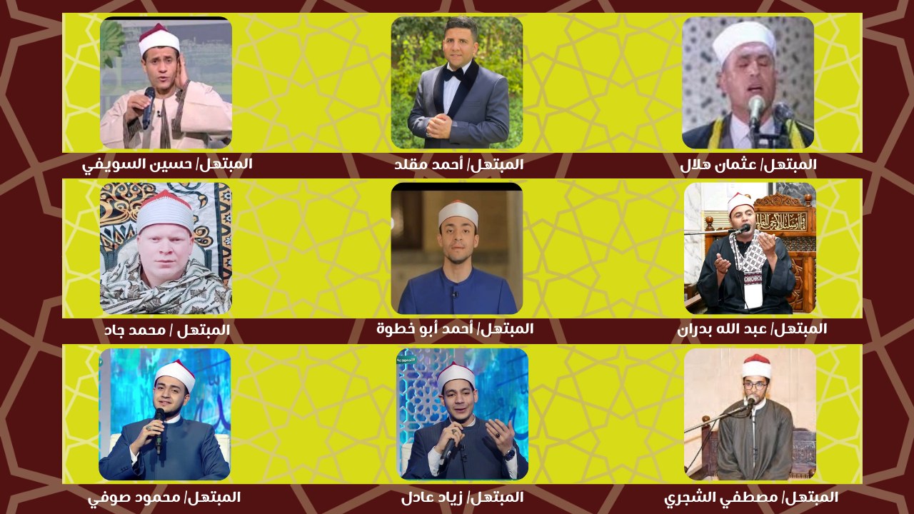 تقام الجمعة القادمة عقب صلاة الجمعة مباشرة ابتهالية كبرى في حب رسول الله صلى الله عليه وسلم) بمسجد عمر بن عبد العزيز ببني سويف، وذلك بحضور كبار المبتهلين وهم: المبتهل أحمد مقلد ، المبتهل عثمان هلال، المبتهل حسين السويفي، المبتهل عبد الله بدران، المبتهل أحمد أبو خطوة، المبتهل محمد جاد، المبتهل مصطفى الشجري، المبتهل زياد عادل، المبتهل محمود صوفي.