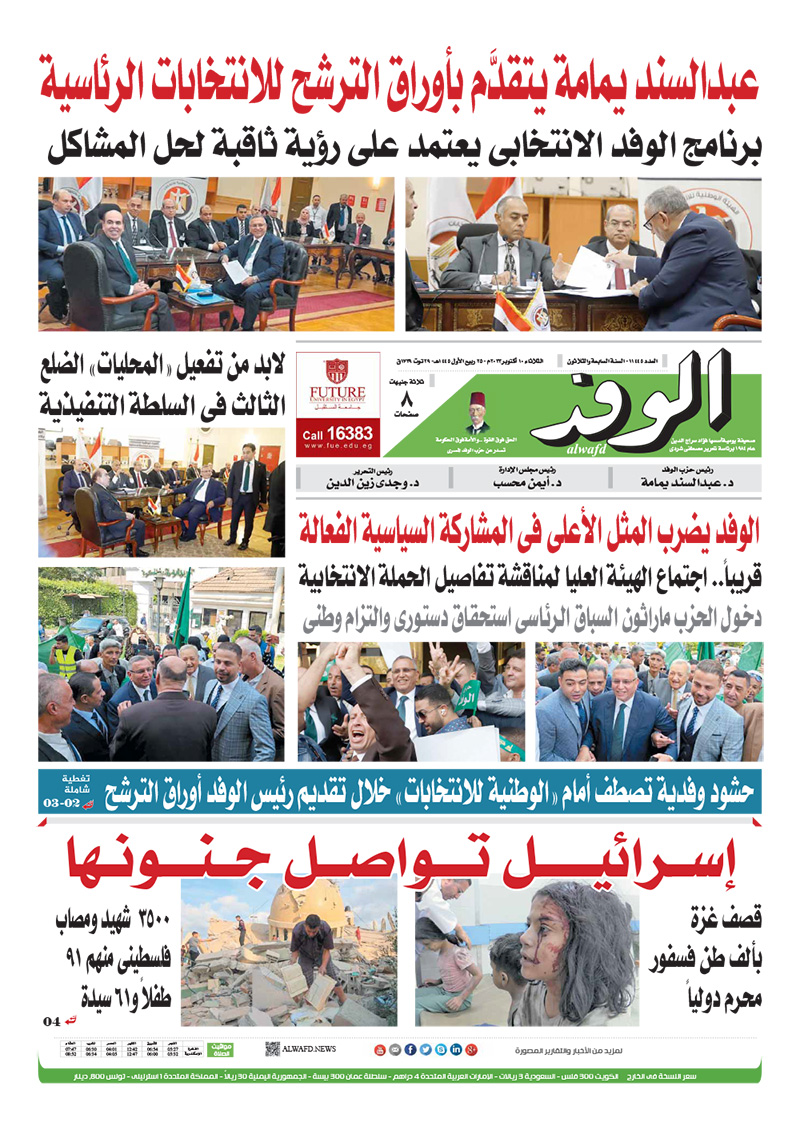 تنشر جريدة الوفد اليومية الورقية في عددها الصادر، غدًا الثلاثاء، العديد من الموضوعات والتقارير الإخبارية المهمة، أبرزها: "عبدالسند يمامة يتقدم بأوراق الترشح للانتخابات الرئاسية".