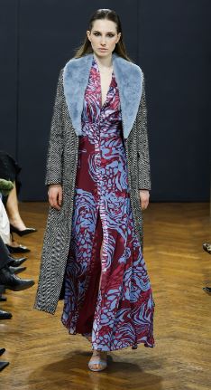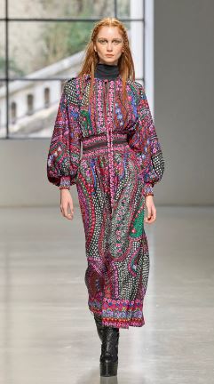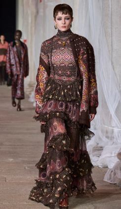 برعت علامة إيترو Etro في تصميم فستان طويل بطبقات كثيرة بأكمام طويلة ولياقة عالية بألوان المتداخلة بالبني والبرتقالي والبنفسج لتتناغم مع ألوان خريف 2023.