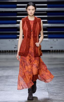 قدمت ماركة Akris فستانًا من دون أكمام مميز بألوانه الخريفية الدافئة، ومنسقًا مع سترة من دون أكمام من نفس لونه مزينة بفراء على الحواف، نسقيه على طريقة العارضة مع حقيبة كتف برتقالية، مع بوت أسود برقبة متوسطة الطول.