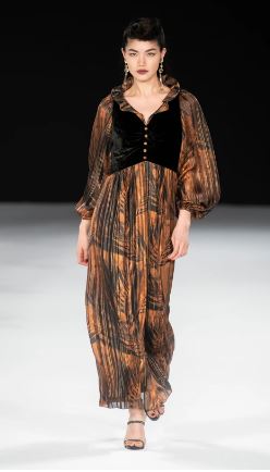 تنوعت موضة فساتين البوهيمية بتصميم الأوفر سايز المصممة بخصر عالي، لتصبح من الصيحات التي ننصح كل من ترغب في إخفاء بروز البطن باعتمادها، ورصدنا ماركة Jun Ashida فستان طويل بني فاتح مشجر بالأسود مصمم بتوب مخمل أسود وأكمام منفوخة على الموضة، جربي تنسيقه مع بوت طويل أسود، وحقيبة كتف باللون الجملي الدافئ.