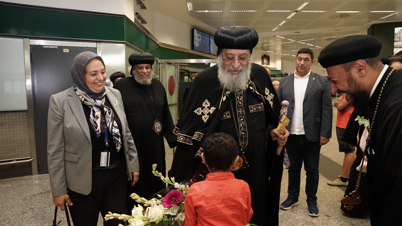 كان في استقبال البابا عدة شخصيات رسمية والتي حرصت على التواجد بالمطار لحظة الوصول وعلى رأسهم السفيرة منال عبد الدايم القنصل العام، والقنصل أحمد البقلي نائب القنصل العام والسيد صبري شكري مندوب العلاقات العامة بالقنصلية والسيد سامح سيد مدير عام محطة مصر للطيران.