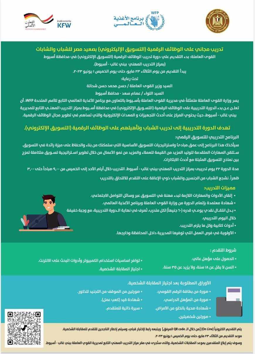 أعلنت وزارة العمل عن افتتاح مديرية العمل بمحافظة أسيوط الدورة التدريبية المجانية على مهن التسويق الإلكتروني بالتعاون مع برنامج الأغذية العالمة التابع للأمم المتحدة WFP، وذلك بمقر قصر ثقافة أسيوط ، وذلك بعد الانتهاء من تقديم الشباب الراغبين فى الحصول على الدورات بمقر ديوان مديرية العمل وعنوانها: مجمع المصالح الحكومية مبنى "ب" بشارع محمود فهمى النقراشى، لمدة أسبوع، والانتهاء من المقابلات الشخصية لمن تنطبق عليهم المعايير والشروط الخاصة بالتدريب.. يأتى ذلك تنفيذًا لتوجيهات حسن شحاتة وزير العمل بالاهتمام بتدريب الشباب من الجنسين على المهن التى يتطلبها سوق العمل بالمحافظات بالتعاون والتنسيق مع الجهات المعنية على أحدث الأساليب التقنية والتدريبية الحديثة، وعلى المهن المستحدثة التى تمكن الشباب من استغلال مواهبهم وقدراتهم فى تحقيق أحلامهم وطموحاتهم فى الحصول على فرص عمل لائقة أو بدء مشروعات صغيرة تسهل مشاركتهم فى التنمية.