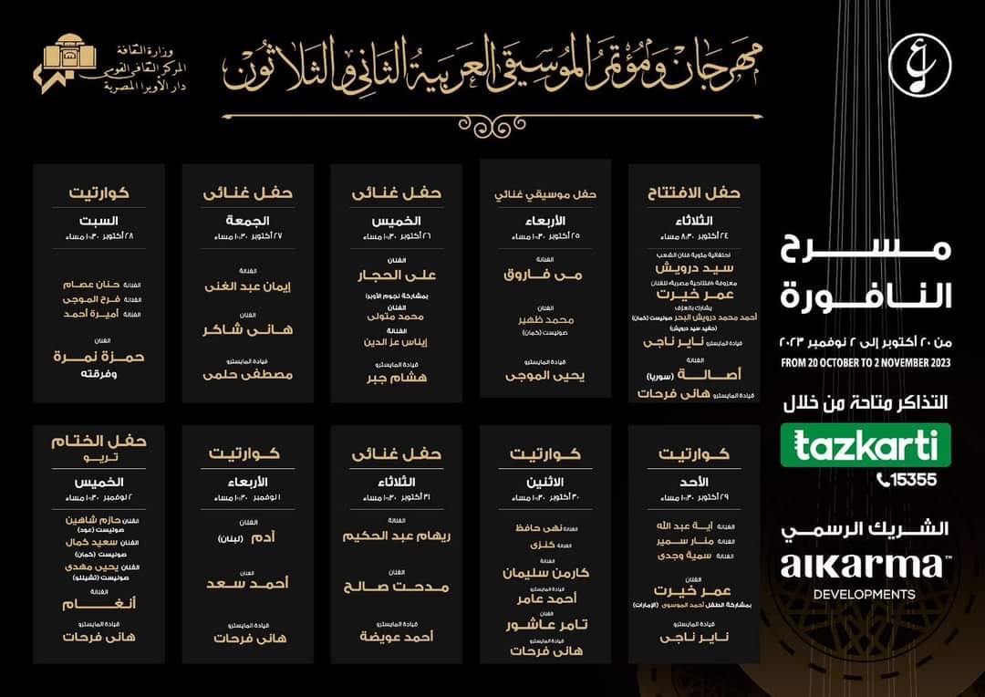 تُطلق دار الأوبرا المصرية فعاليات الدورة الـ32 من مهرجان ومؤتمر الموسيقى العربية المهداة إلى اسم فنان الشعب الموسيقار سيد درويش اعتبارا من يوم الجمعة 20 أكتوبر وتختتم مساء الخميس 2 نوفمبر وتضم 38 حفلًا غنائيًّا وموسيقيًّا بمشاركة 120 فنانًا و5 جلسات علمية بمشاركة 61 باحثًا ومقرر وصاحب تجربة من 18 دولة عربية وأجنبية، هى: مصر، سوريا، المغرب، لبنان، الإمارات، الأردن، تونس، سلطنة عمان , ليبيا , العراق , البحرين , الكويت , فلسطين , السودان , الجزائر , السعودية , أمريكا , ألمانيا، وتقام على مسارح الأوبرا المختلفة بالقاهرة (النافورة، الكبير، الصغير، معهد الموسيقى العربية، الجمهورية) ، مسرح سيد درويش ( أوبرا الإسكندرية ) ومسرح أوبرا دمنهور.