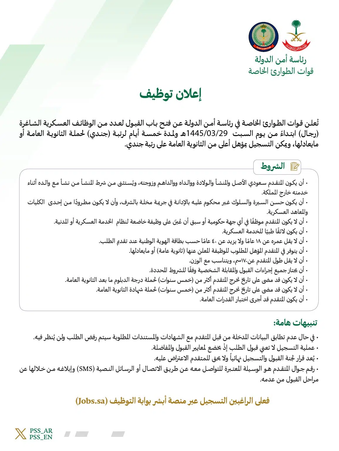 وأوضحت قوات الطوارئ الخاصة في رئاسة أمن الدولة السعودية أن هناك عدد من الشروط والتنبيهات الخاصة بالتقديم لابد أن يطلع عليها المتقدم على الوظائف قبل التسجيل فيها، ومنها: