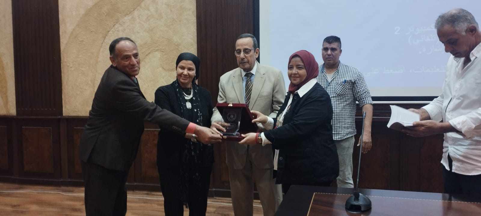 وقدّم التكريم نيابة عن الأستاذ عمرو البسيوني رئيس الهيئة العامة لقصور الثقافة، الدكتورة حنان موسى رئيس الإدارة المركزية للدراسات والبحوث والدكتورة دينا هويدي، مدير عام ثقافة المرأة والمشرف التنفيذي للملتقى.
