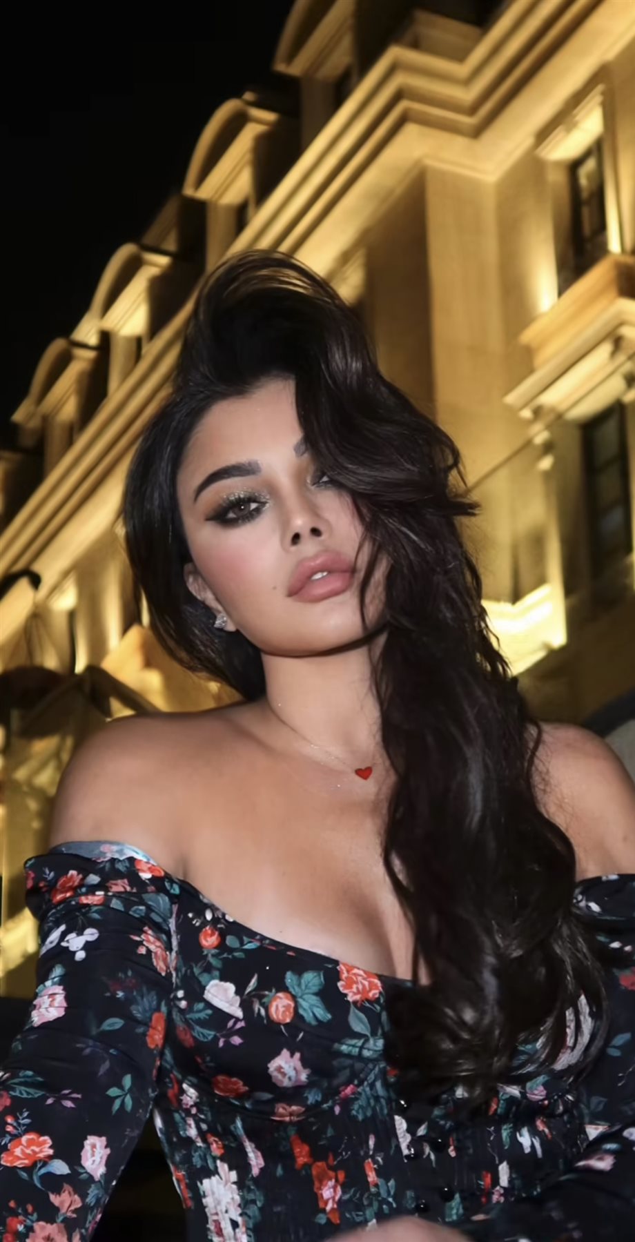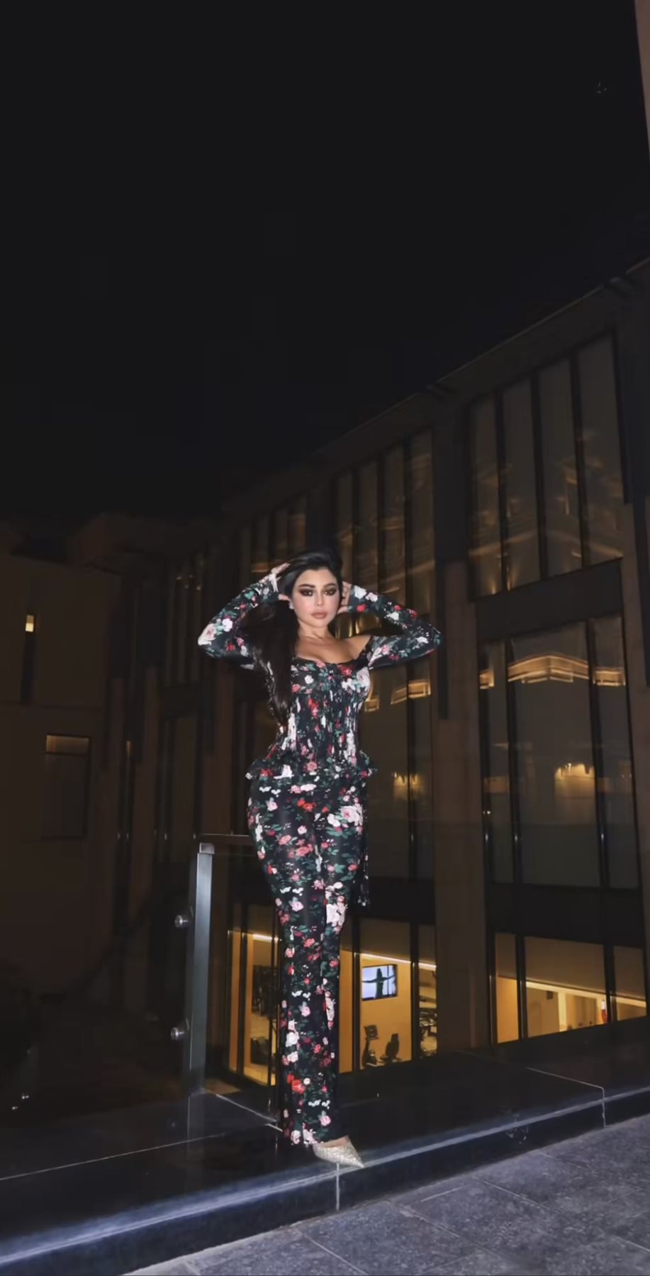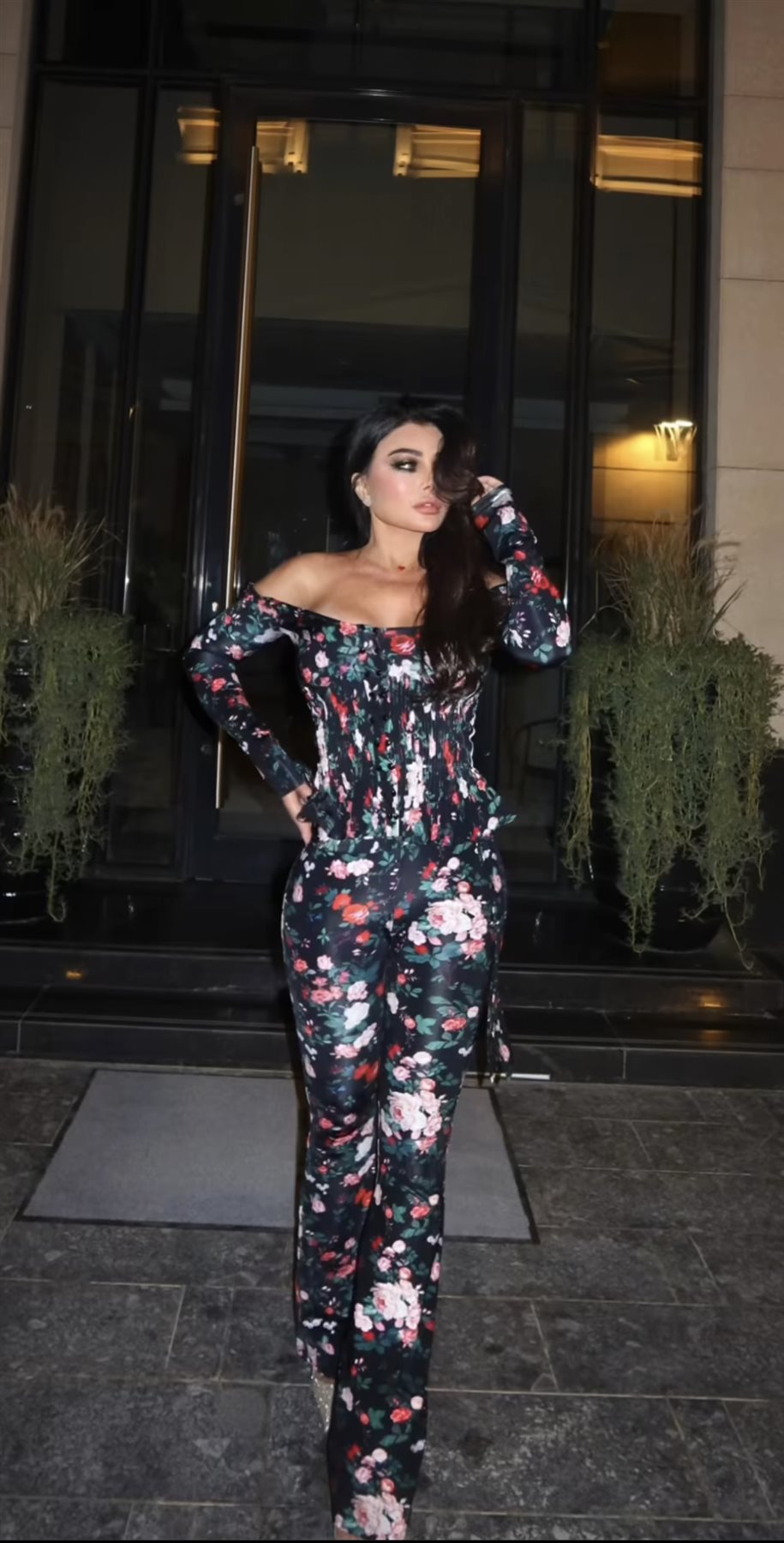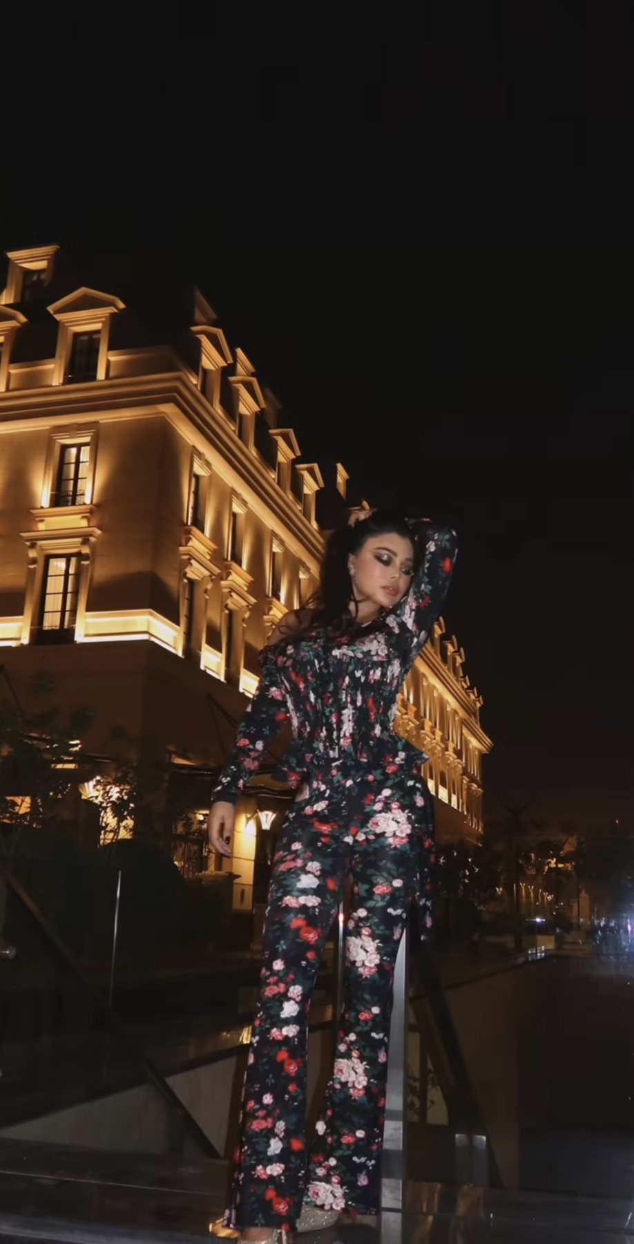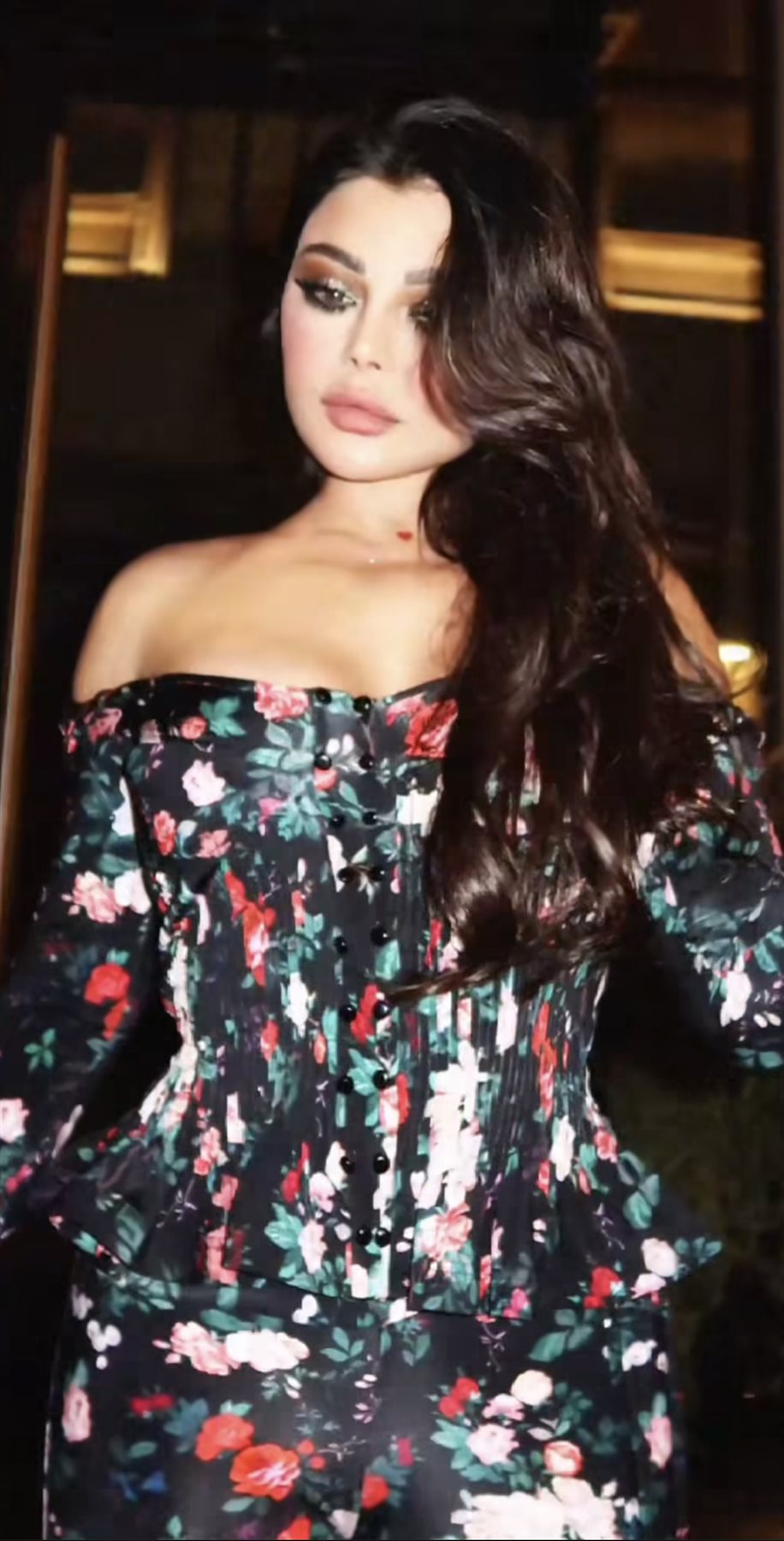 وظهرت هيفاء وهبي بسوت كاجوال مشجرة بالورود الملونة بالأحمر والوردي، وكانت عبارة عن بنطال مُجسم، وعليه بلوزة قصيرة بصيحة الأوف شولدر مطرزة بأزرار من المنتصف، مما أبرزت أنوثتها وقوامها الممشوق.