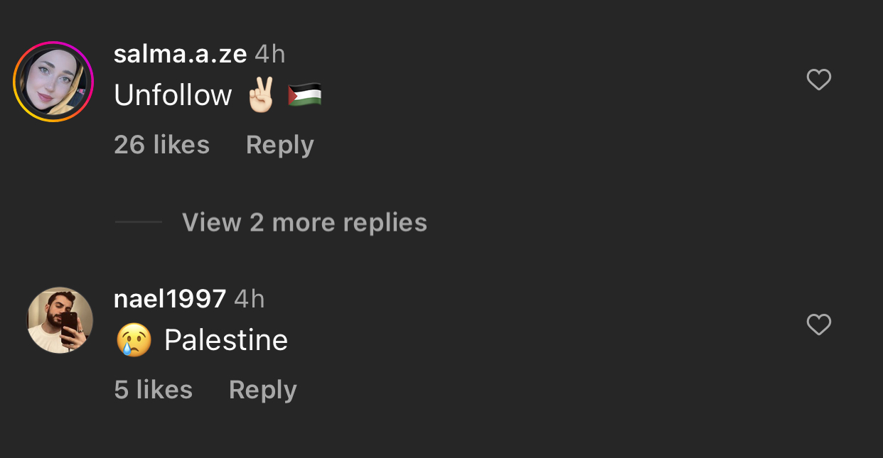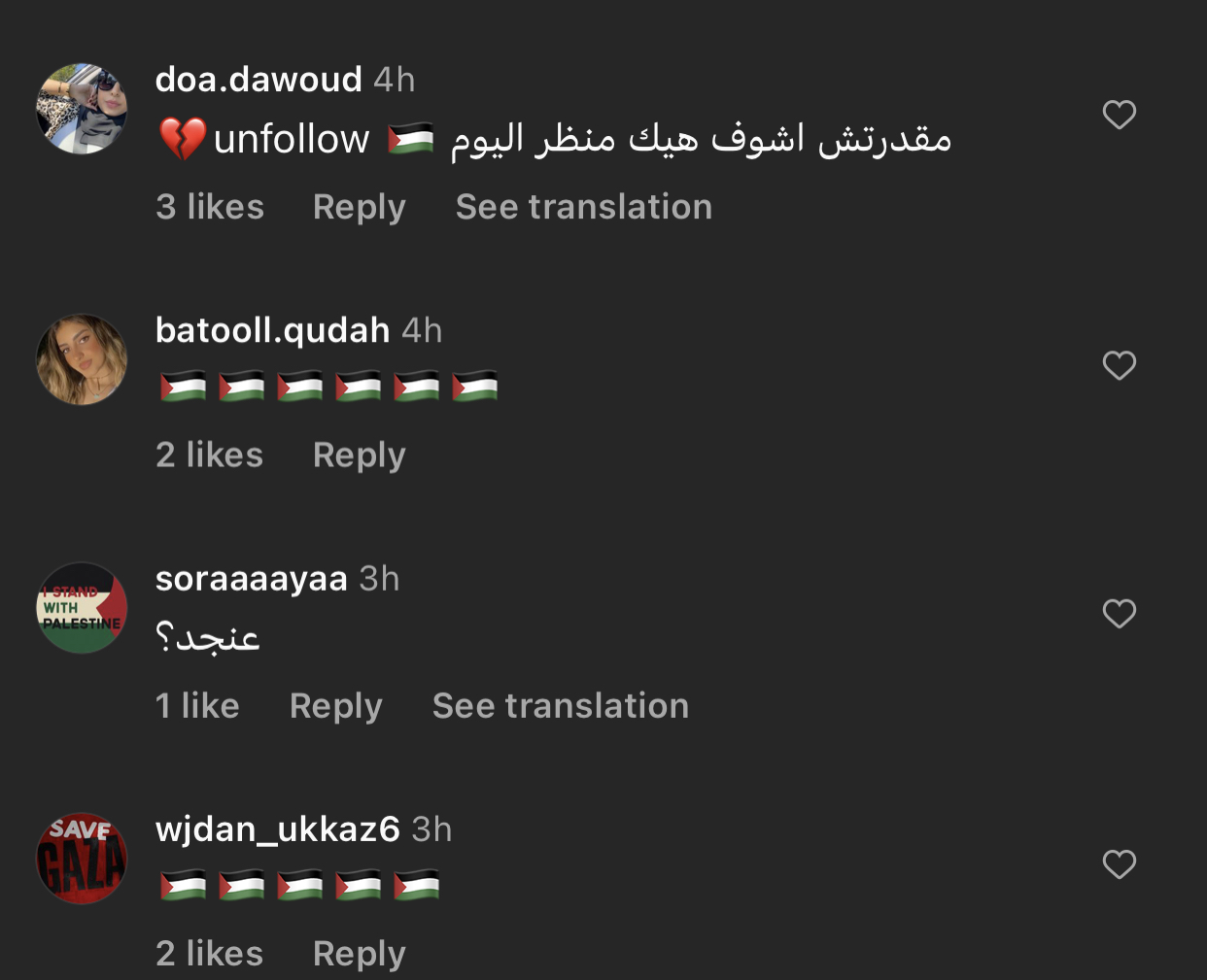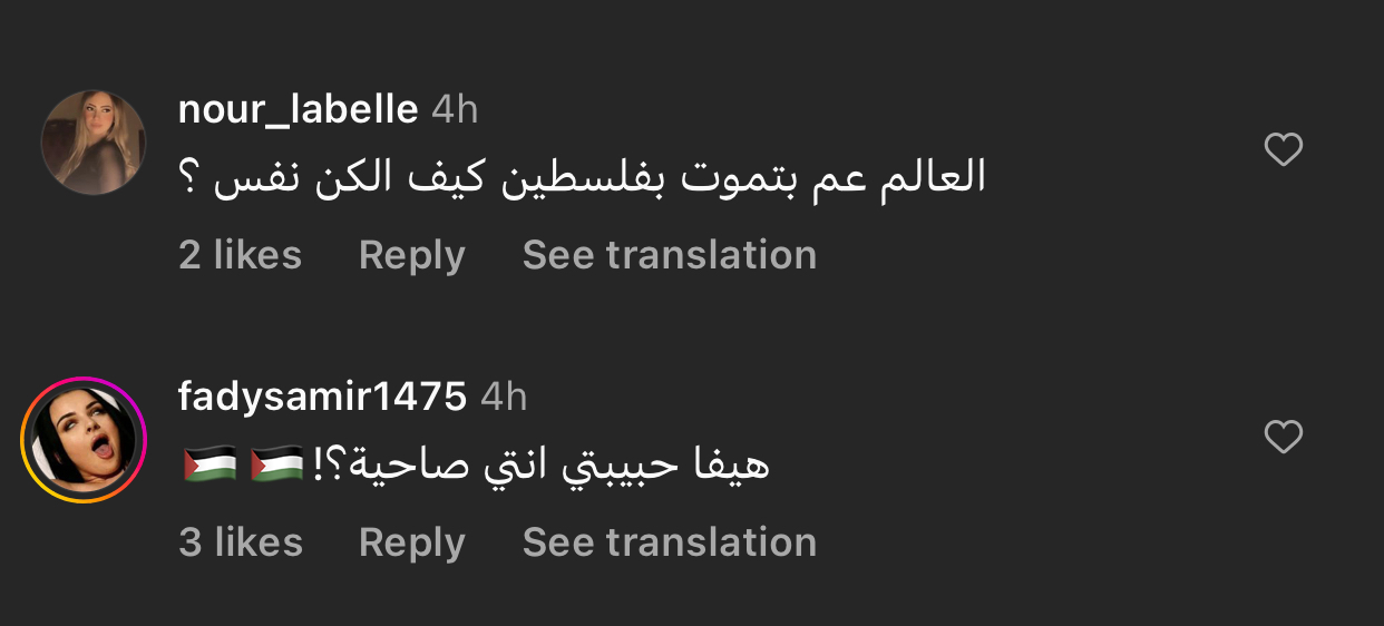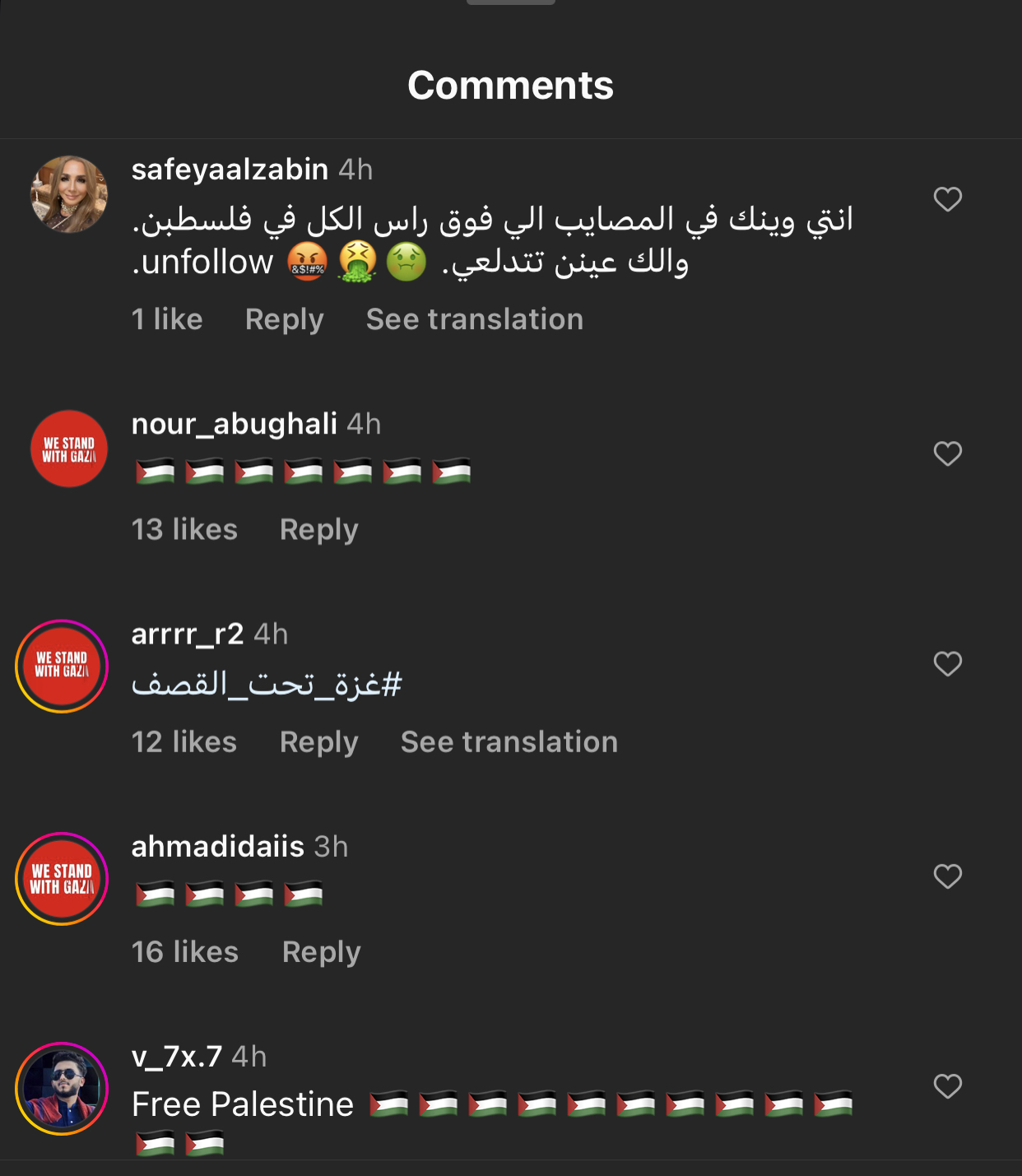 ولاقت هيفاء وهبي هجوم كبير واتهامها بعدم مراعاة ما يحدث في فلسطين، لذا طالب الكثير من المعلقين علي المنشور بإلغاء المتابعهة لها.