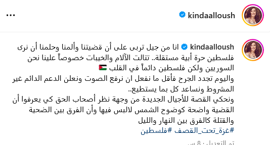 نشرت كندة علوش رسالة مؤثرة عن دعمها للقضية الفلسطينية بقوة
