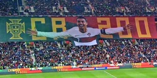 ورفعت جماهير البرتغال، لافتة تحمل الرقم 200 وصورة رونالدو، احتفالا ببلوغ هذا العدد التاريخي من المباريات.