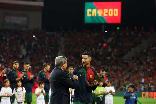 وقبل غناء النشيد الوطني، حصل البرتغالي على جائزة شرفية، بعد وصوله لهذا العدد من المباريات.