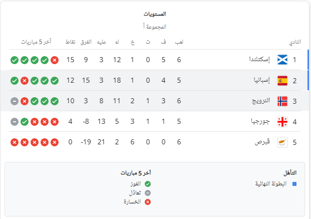 يتصدر المنتخب الإسكتلندي ترتيب المجموعة الأولى بـ 15 نقطة، فيما تحل إسبانيا في الوصافة بـ 12 نقطة، والنرويج ثالثًا بـ 10 نقاط.