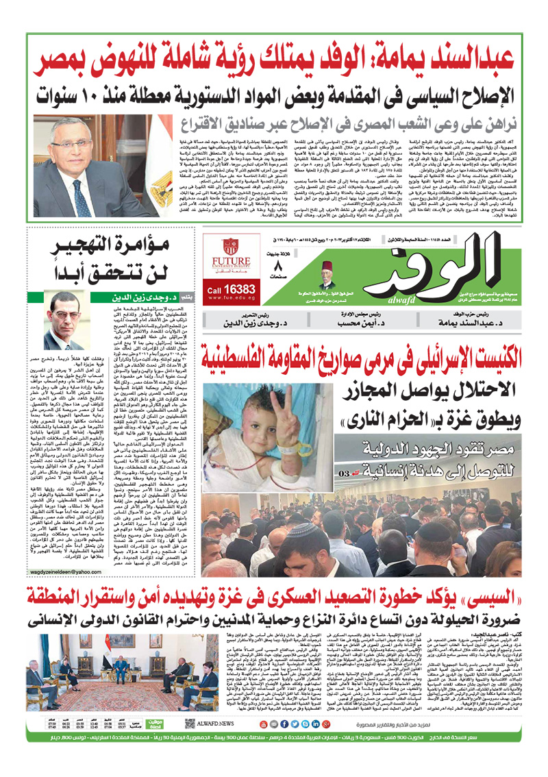 تنشر جريدة الوفد اليومية الورقية في عددها الصادر، غدًا الثلاثاء، العديد من الموضوعات والتقارير الإخبارية المهمة، أبرزها: "عبدالسند يمامة: الوفد يمتلك رؤية شاملة للنهوض بمصر".