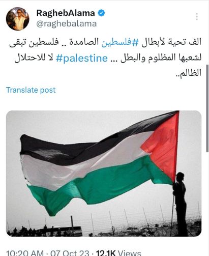كما علق  المطرب اللبناني راغب علامة على عملية طوفان الأقصي، وكتب عبر حسابه الرسمي بموقع إكس، تويترسابقًا، "ألف تحية لأبطال فلسطين الصامدة.. فلسطين تبقى لشعبها المظلوم والبطل.. لا للاحتلال والظلم".