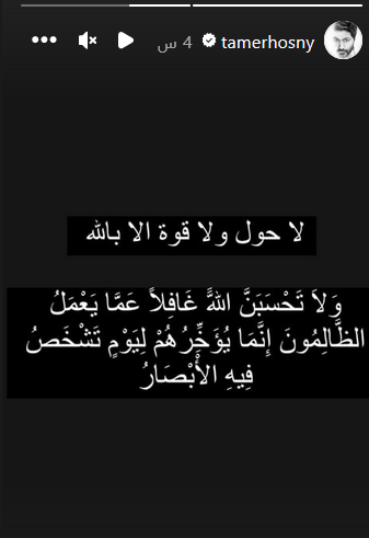 وعلق تامر حسني مستشهدًا بآية من القرآن الكريم" ولا تحسبن الله غافلا عما يعمل الظالمون إنما يؤخرهم ليوم تشخص فيه الأبصار".