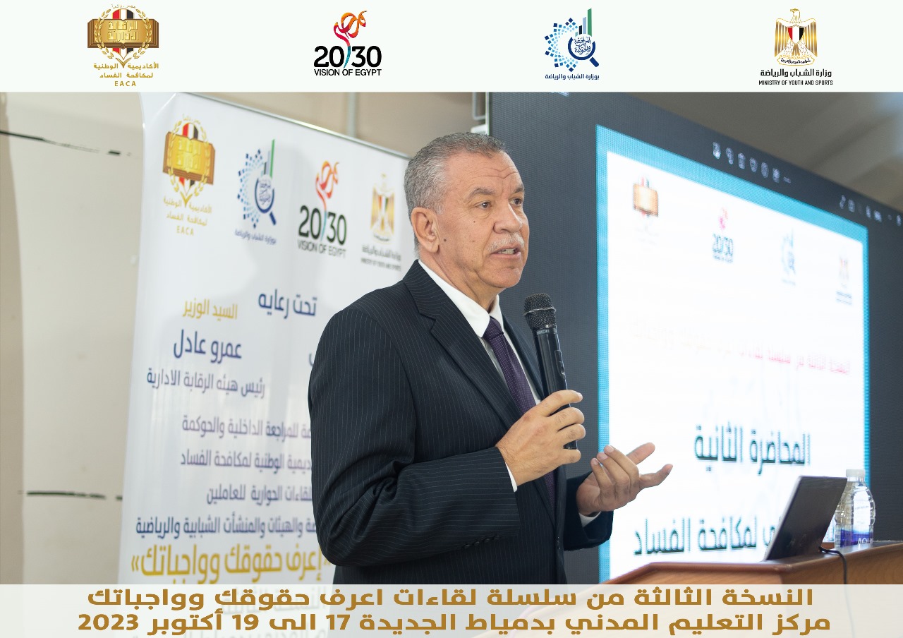 وتناولت المحاضرة الثانية والتي ألقاها اللواء دكتور نبيل محمود حسن أستاذ القانون الجنائي بأكاديمية الشرطة الإطار القانوني لمكافحة الفساد، متناولاً مفهوم الفساد وأنواعه والجرائم المرتبطة به وسبل الوقاية منها.