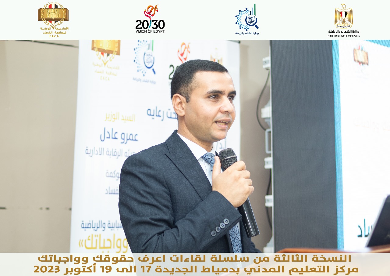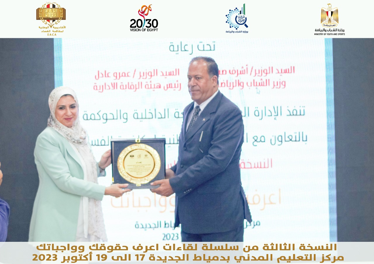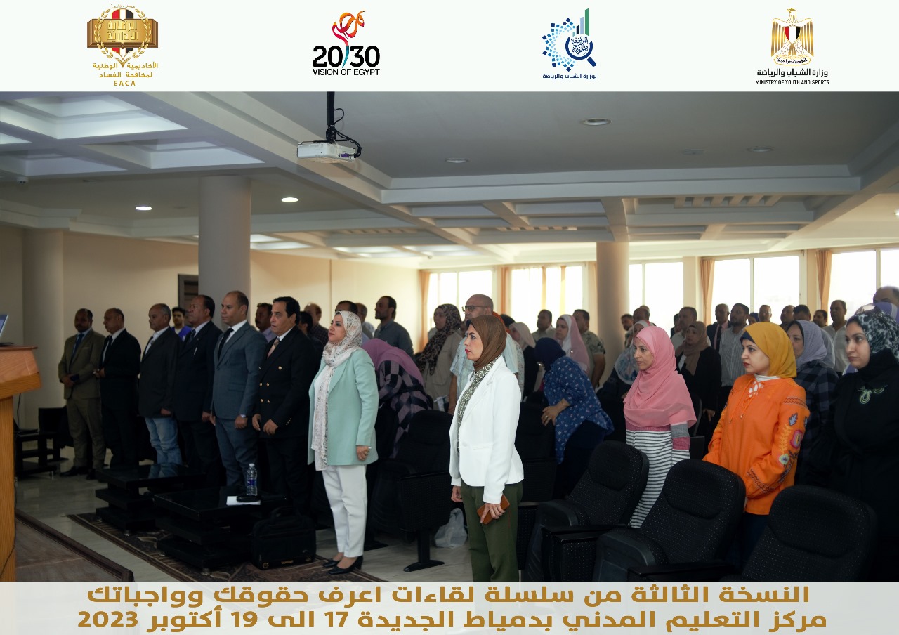 أطلقت وزارة الشباب والرياضة من خلال الإدارة العامة للمراجعة الداخلية والحوكمة بالتعاون والتنسيق مع الأكاديمية الوطنية لمكافحة الفساد، فعاليات النسخة الثالثة من سلسلة لقاءات "اعرف حقوقك وواجباتك"، والتي يتم تنفيذها خلال الفترة من (١٧-١٩) أكتوبر الجاري، بمركز التعليم المدني بدمياط الجديدة.