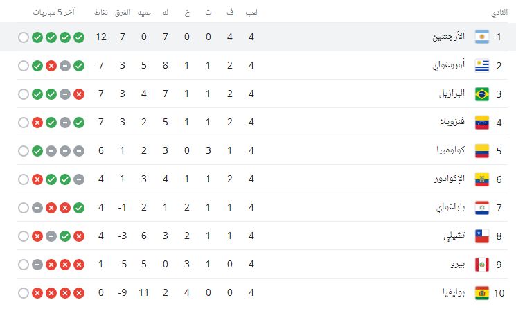 ـ حقق منتخب الأرجنتين الفوز الرابع على التوالي ليتصدر تصفيات أمريكا الجنوبية لكأس العالم ٢٠٢٦ بالعلامة الكاملة.