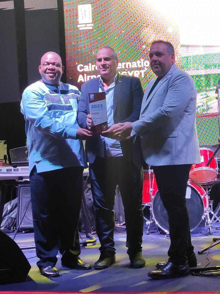 وقام إيمانويل تشافيز رئيس المجلس الدولي للمطارات لقارة افريقيا بتسليم الجائزة للملاح/خالد الالفي مساعد رئيس مجلس إدارة الشركة المصرية القابضة للمطارات والملاحة الجوية.