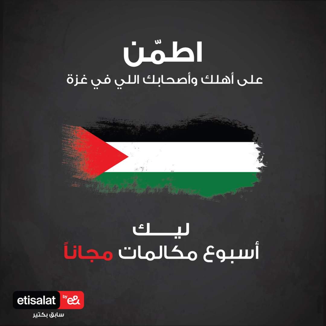 قالت الشركة عبر صفحتها الرسمية على موقع التواصل الاجتماعي فيسبوك: “اتصالات دايماً معاك وعشان تطمئن على أهلك وأصحابك في غزة عملنا لك أسبوع مكالمات مجانية ابتداءً من 19 اكتوبر تكلم بيهم غزة مجانا”.