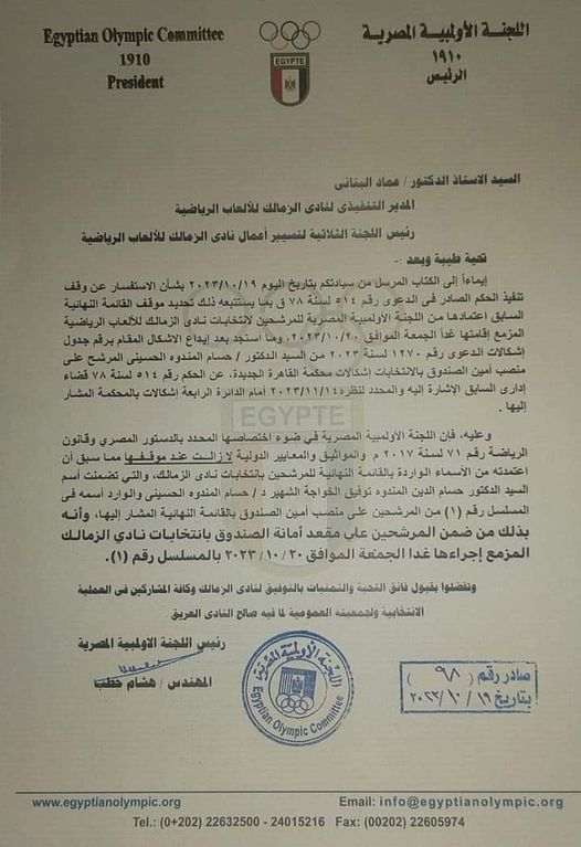 حيث أرسلت اللجنة الأولمبية المصرية، خطابًا الي اللجنة الثلاثية المكلفة لإدارة نادي الزمالك، برئاسة الدكتور عماد البناني، تفيد فيه باستمرار حسام المندوه، المرشح علي منصب أمين الصندوق، بعد قانونية ترشحه.