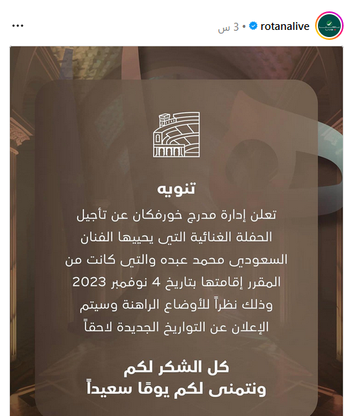 كان من المقرر إقامة الحفل في الـ 4 من نوفمبر القادم على مسرح خورفكان الشهير بالإمارات، وأعلنت الشركة المنظمة عن تأجيله نظرًا للأوضاع الراهنة وسيتم الإعلان عن الموعد الجديد لاحقًا.
